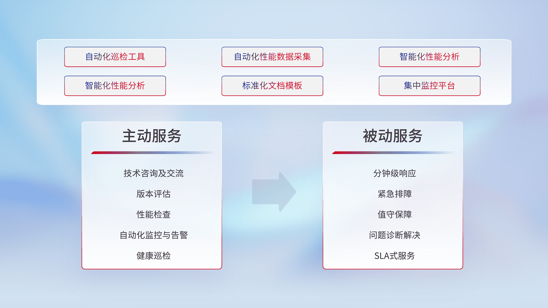 智能化工具和标准化文档,,,保障服务质量,,,,提供主动服务(包含技术咨询、、、版本评估、、、、性能检查、、自动化监控与告警、、、、健康巡检)和被动服务包含(分钟级响应、、、紧急排障、、、值守保障、、、问题诊断解决、、SLA服务)。。